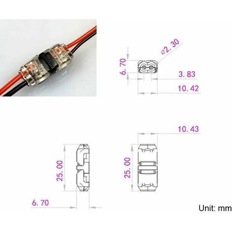 Utilisé pour connecter une paire. Longueur 25mm, largeur 10.4mm, hauteur 6.7mm. Charge max. 300V / 5A – 20AWG/0,32 – 0,52mm2