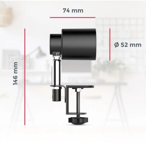 DIMENSIONS : la lampe à pince métallique est d’une hauteur totale de 146mm, pour une profondeur de 74mm, le diamètre de l’abat-jour est de Ø52mm, la longueur du câble est de 180cm.