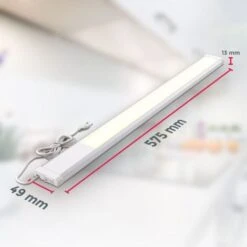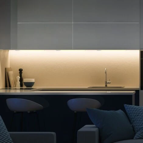 - Avec 3.000 kelvins, la lampe sous l’armoire offre une agréable couleur de lumière blanc chaud. Sur une longueur de 575 mm, la platine LED fixe de 1.100 lumens assure un éclairage extrêmement puissant de votre plan de travail.