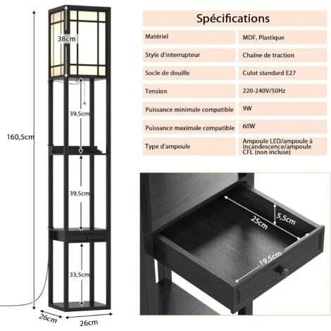 - La base standard E27R-A permet à ce lampadaire de s’adapter aux ampoules LED, aux ampoules à incandescence et aux ampoules à économie d’énergie (non incluses).