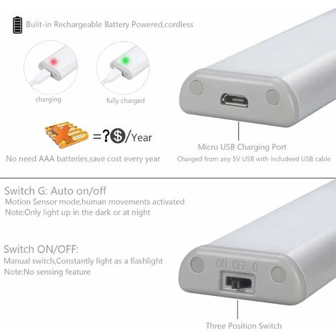 [2 modes de capteur]: 2 modes d’éclairage: passer en « G »: s’allume automatiquement lorsqu’un mouvement humain est détecté dans l’obscurité ou la nuit, si aucun mouvement n’est à nouveau déclenché, l’environnement ou l’environnement sera automatiquement désactivé après 20 secondes Daytime); interrupteur sur « on »: allumé en permanence, et peut également être utilisé comme lampe de poche ou éclairage de secours.
