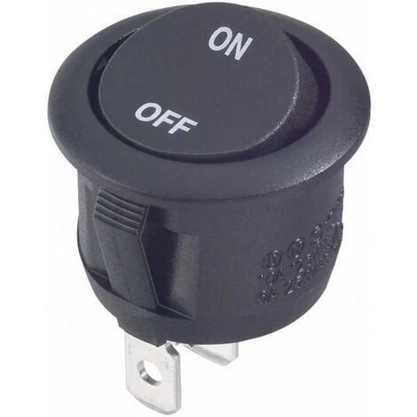 Conditionnement : 1 pc(s) · Connexion : cosses plates 4.8 mm · Couleur boîtier/bouton : noir · Courant de commutation (max.) : 6 A · Diamètre de montage : 20 mm · Fonctions (interrupteur/bouton) : permanent · Motif d’impression : OFF/ON · Position de commutation : 1 x Off/On · Tension de commutation : 250 V/AC · Type (type fabricant) : R13-112A-02 BB ON/OFF · Type d’interrupteur/bouton (catégorisation) : Interrupteur à bascule · Type d’éclairage : sans · Épaisseur panneaux frontaux : 2 mm