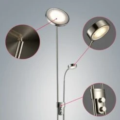 PRODUIT – lampadaire / lampe à pied LED en métal finition nickel matte dimmable avec liseuse orientable, modules LED intégrés : 21 Watt pour le lampadaire et 3,5 Watt pour la lampe de lecture orientable, hauteur totale 1800 mm.
