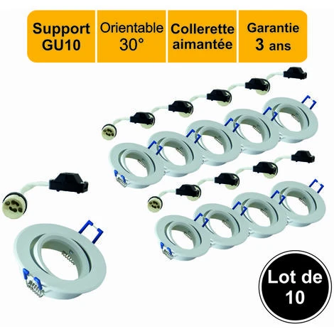 Lot de 10 supports spot blanc encastrable aimanté orientable blanc avec douille GU10 inclus