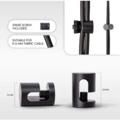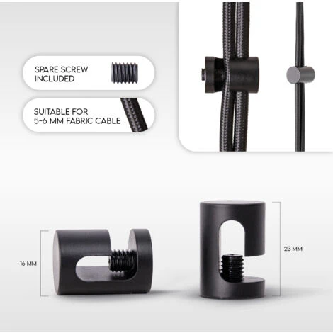 Disponibles en noir ou en blanc, les clips à câble et les crochets sont fabriqués en aluminium haut de gamme. Vous êtes donc sûr quils seront à la fois esthétiques et robustes. Ces deux accessoires sont pourvus de vis réglables en plastique pour ne pas endommager le câble. Leur large ouverture permet de les utiliser facilement pour tous les câbles en tissu usuels de 5-6 mm de diamètre.