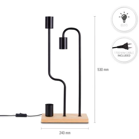 Lampe de table avec douille E14 ou lampadaire avec deux douilles E27, câble avec fiche CEE, poids : lampadaire : 1,73 kg, lampe de table : 0,43 kg, 220-240 V, 50/60 Hz, classe de protection : II, température ambiante maximale : 40 °C, douille E14 ou E27, source recommandée pour la lampe de table : C35, source recommandée pour le lampadaire : A60, puissance maximale : 40 W.