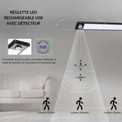 Caractéristiques de la Réglette LED Rechargeable USB 60cm 2,5W Noire avec Détecteur de mouvement