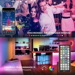 【fa?ons conviviales de contr?ler vos lumières】①Télécharger l’application « Illumi home »(Disponible sur Google Play et iOS App Store) vous pouvez régler la luminosité, changer les couleurs, allumer / éteindre la bande LED RGB. ②Livré avec micro intégré sensible dans l’interrupteur de contr?leur, les lumières vont pulser et changer de couleurs avec le son et la musique de l’environnement. ③Mise à niveau 4 mode de musique, télécommande IR avec 44 boutons pour contr?ler la bande lumineuse LED.