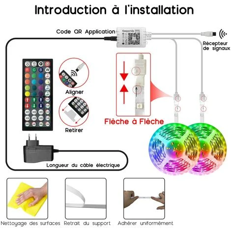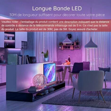 Sync avec Rythme de Musique : Les couleurs changent automatiquement en fonction du son,APP offre 16 millions de couleurs, des couleurs personnalisées, 28 modes dynamiques et une fonction de minuterie. Déclarez spécifiquement que la taille du produit est de 30M et non de 5M.Certains clients ont confondu le texte Remote Distance:Within 5m au dos de l’emballage avec la description de la taille du produit. En fait, cette description en anglais signifie que la distance de la télécommande est de 5M Application intelligente et télécommande infrarouge : vous pouvez tamiser les lumières et personnaliser les couleurs que vous aimez sans quitter votre lit, installer la bande Led de 30M autour du plafond, sous les armoires, derrière le cadre du lit et emporter toute votre maison avec vous. Installation facile : Avec un adhésif puissant, les bandes lumineuses peuvent être fermement collées sur des murs en bois ou en laque et sur d’autres surfaces propres, il suffit de suivre les instructions du manuel et vous pouvez terminer en quelques minutes. Découpable et connectable : Ruban led sont coupées uniformément le long de la ligne proposée, tandis que bande Led restantes peuvent être reconnectées via des connecteurs sans soudure (les connecteurs ne sont pas inclus dans la boîte) Largement utilisé : Lumiere led apportent chaleur et romantisme à votre salle à manger, chambre à coucher, escalier, cadre de porte, arrière de la télévision, bureau, coin, bar, salle de réunion et salon.
