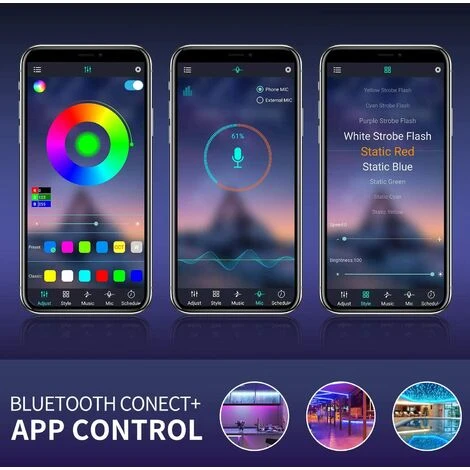 Vous pouvez sélectionner 16 millions de couleurs et 28 modes de style que vous souhaitez, profiter du changement de couleur avec le microphone et le mode de synchronisation de la musique, des heures prédéfinies pour que les lumières s’allument ou s’éteignent automatiquement, ajustez la luminosité ou la vitesse des lumières led, bricolage les couleurs que vous préférez, etc.