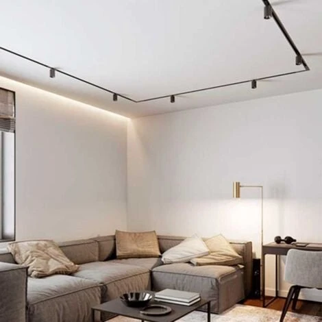 Spot sur rail monophasé avec douille GU10, idéal pour éclairer les grandes surfaces et les hauts plafonds. La lumière émise par les projecteurs est focalisée et dirigée avec précision pour mettre en évidence les caractéristiques des objets à distance.