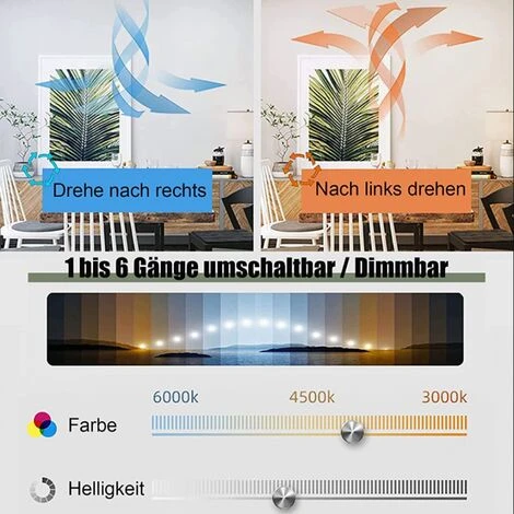 - Ventilateur de plafond avec éclairage, ventilateurs et lumières peuvent fonctionner en même temps/individuellement, dimmable avec télécommande APP, température de couleur 3000K-6000K, luminosité 5%-100%, 1 à 6 niveaux de réglage du volume d’air, mode veille, fonction mémoire , fonction d’arrêt de la minuterie.