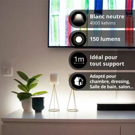 - Ce ruban LED lumineux de 1 mètre délivre une lumière blanc neutre (4000K) de 150 lumens.